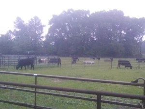 Once again, it was time to work the cows and wean the calves. Charlie and Jason discussed the meds to use this time for the injections and fly control. Charlie purchased the supplies and gathered together the equipment. Jason checked over the supplies and grabbed a few more. It was a nice cool morning which made it more comfortable for us and for the cows branding was on the agenda. We had gathered all of them up in the pen the night before and, as you can see, they didn’t really suspect anything was going on…until the cowboy drove into the driveway. Could they really remember the sound of the motor of his truck???