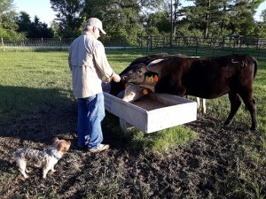 All of the calves are eating cubes from our hands and we walk among them several times a day to help them become accustomed to us. Our approach to raising cattle is to take good care of them and treat them as gently as possible which is accomplished by handling them often with care and respect.